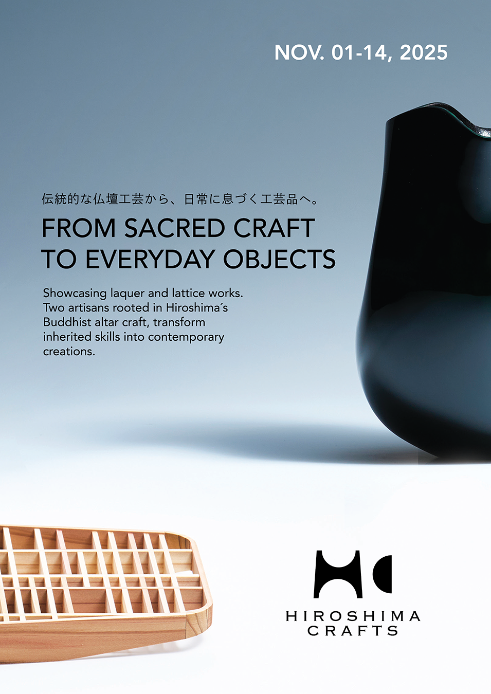 本展は、「FROM SACRED CRAFTS TO EVERYDAY OBJECTS-伝統的な仏壇工芸から、日常に息づく工芸品へ。」をテーマに、広島仏壇の高度な技術を受け継ぐ二人の工芸家が、受け継がれた手わざを現代の暮らしに調和する造形・日用品へと昇華させた作品を紹介します。