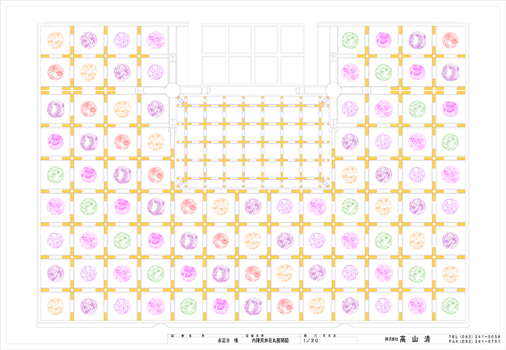 内陣の格天井(宮殿上は折り上げ格天井)部分は、黒塗・手打本金鍍金金具打ち、天井花絵は8種・本金紙に8種類手書京彩色花丸描、繰上天井には栗鼠と葡萄の彩色絵仕上げ、御門柱枡・巻下げは京彩色仕上げ